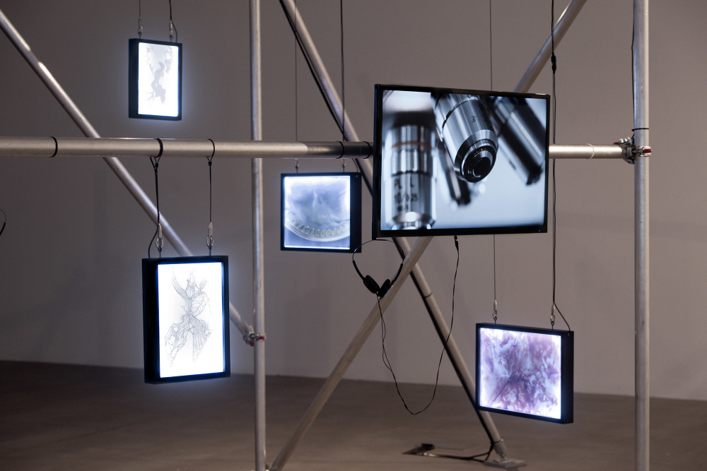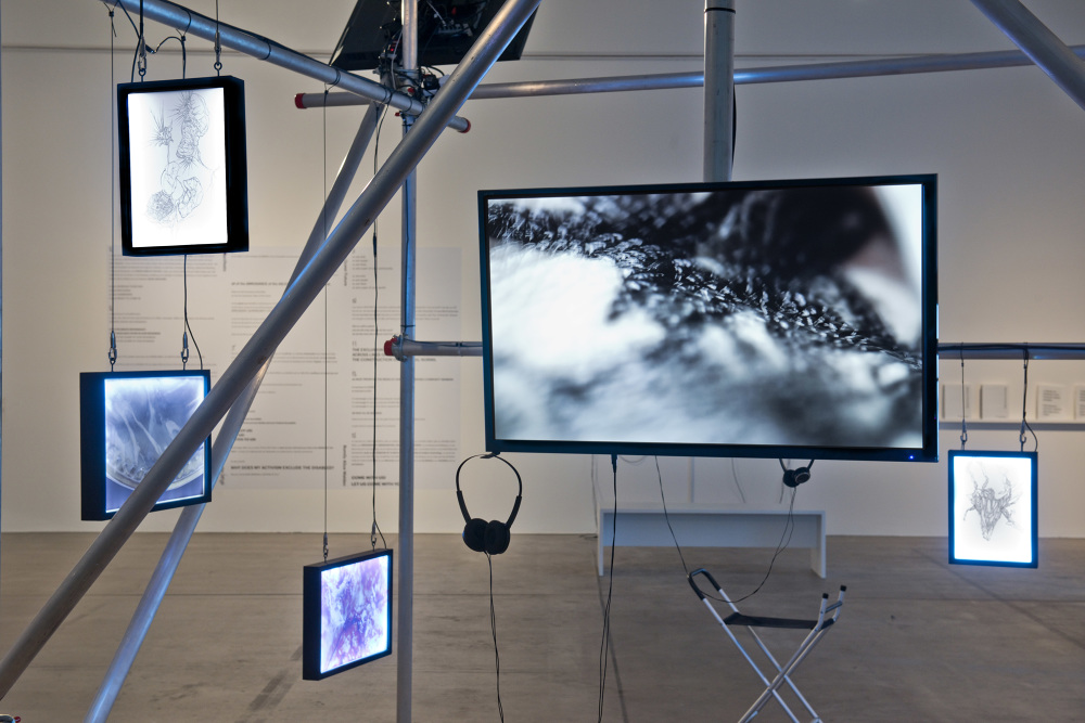 It includes footage shot at the Comfrey Project in Gateshead – a community garden and centre that offers horticultural therapy for refugees and people seeking asylum, and a DIY biohacking lab with queer performance collective Quimera Rosa. Other footage includes drawings onto the artist’s skin, used medical ephemera, and methods for overcoming self-harming behaviours, including compulsive skin picking i.e. Dermatillomania or Excoriation Disorder. Custom-made light-boxes display photographs and drawings based on kidney dissections, referring to the artist having Chronic Kidney Disease.